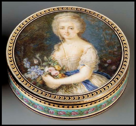 Boite-A-Portrait or Tabatiere-A-Portrait: This is really a case of the chicken and the egg here. Boite-A-Portrait means portrait box in English. Portrait boxes existed before the age of the snuff box. They were usually circular and tended to have colorful floral scenes. However, as snuffing became more popular, portrait boxes were converted to snuff boxes. So today the question becomes, when looking at a circular enameled box, is it a portrait box or is it a snuff box? If the portrait box was produced during the same time period as snuff boxes, then it really becomes confusing. You really just have to look at each box on a case by case basis and go from there.